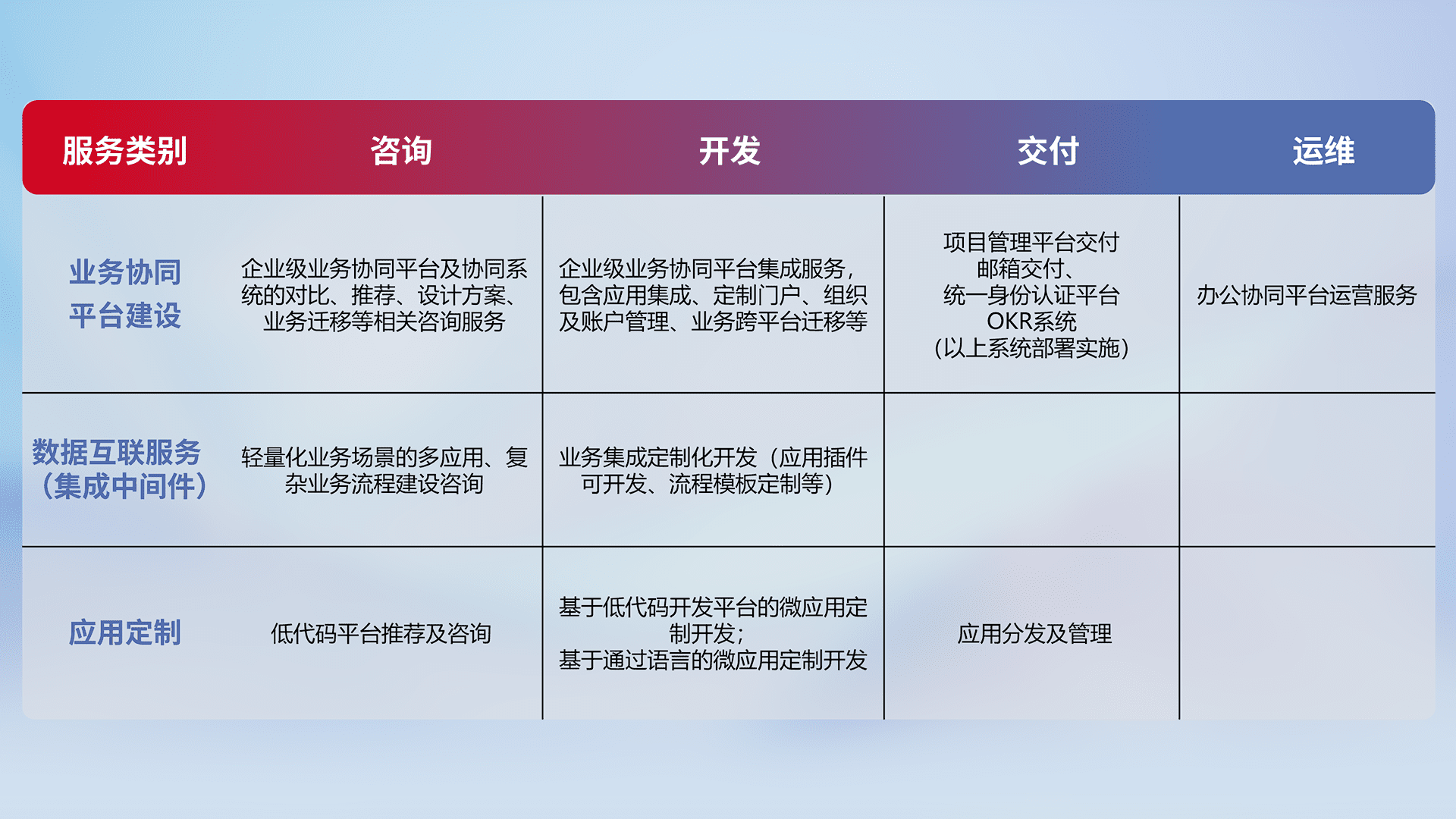 针对钉钉、、、、企微、、、、IDaas等平台级产品提供产品的规划、、、、方案、、、交付、、、定制化开发等服务,,,,实现如统一协同办公、、智能客户服务、、、、混合会议管理、、智能数据查询、、、、等业务场景,,,,实现数字化转型。。。