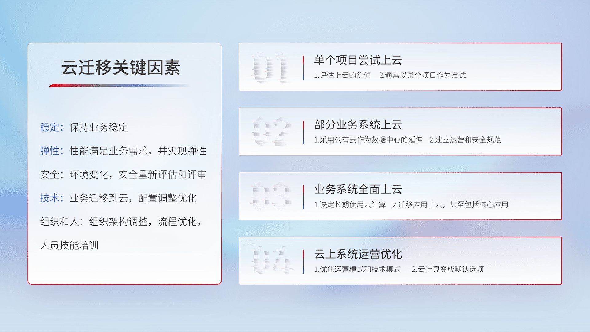 结合实际业务,,,从规划设计、、、云平台选型、、、、云原生改造、、、、数据迁移、、、集成交付,,,,迁移全过程为客户识别最佳上云路径,,做好风险识别管理,,设计网络架构、、、身份权限、、、安全审计合规、、操作审计、、、、日志审计、、、、监控告警策略、、多站点容灾设计等,,对云上基础设施进行整体规划,,提升IT治理水平,,以满足弹性、、、、高可用、、、高性能的需求。。。。