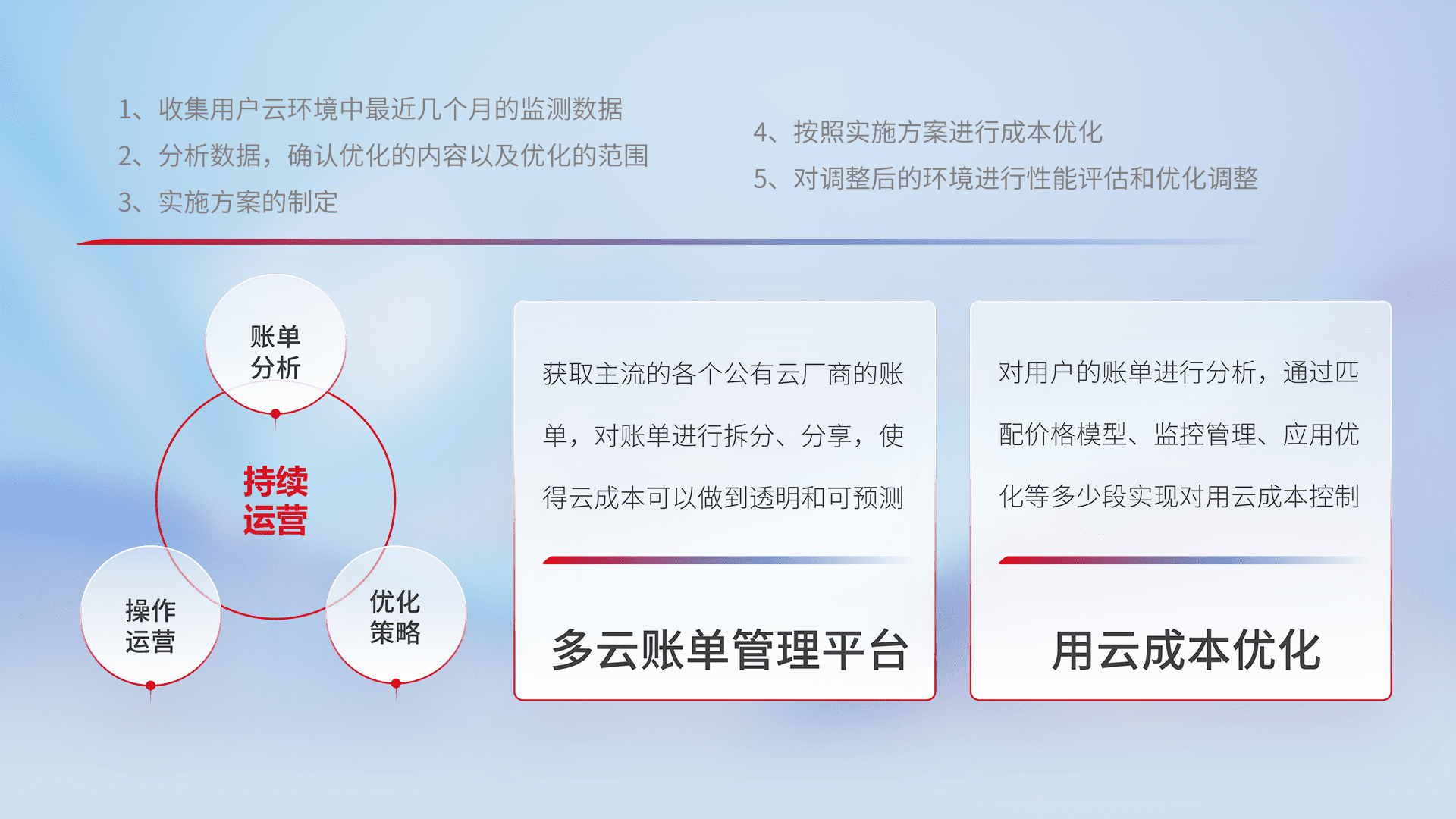 通过多云纳管,,,,以统一的资源数据模型把客户的云资源进行抽象和封装,,,进而实现对多云资源的统一操作,,,保障云资源管理的可靠性、、、稳定性与可用性。。量身定制化运维内容,,配置、、、、开发运维、、、、补丁管理、、、、备份、、监控、、认证和访问管理、、、、审计和日常巡检等,,,,保障在用云过程中的可靠度,,,,稳定度以及高可用率。。。。