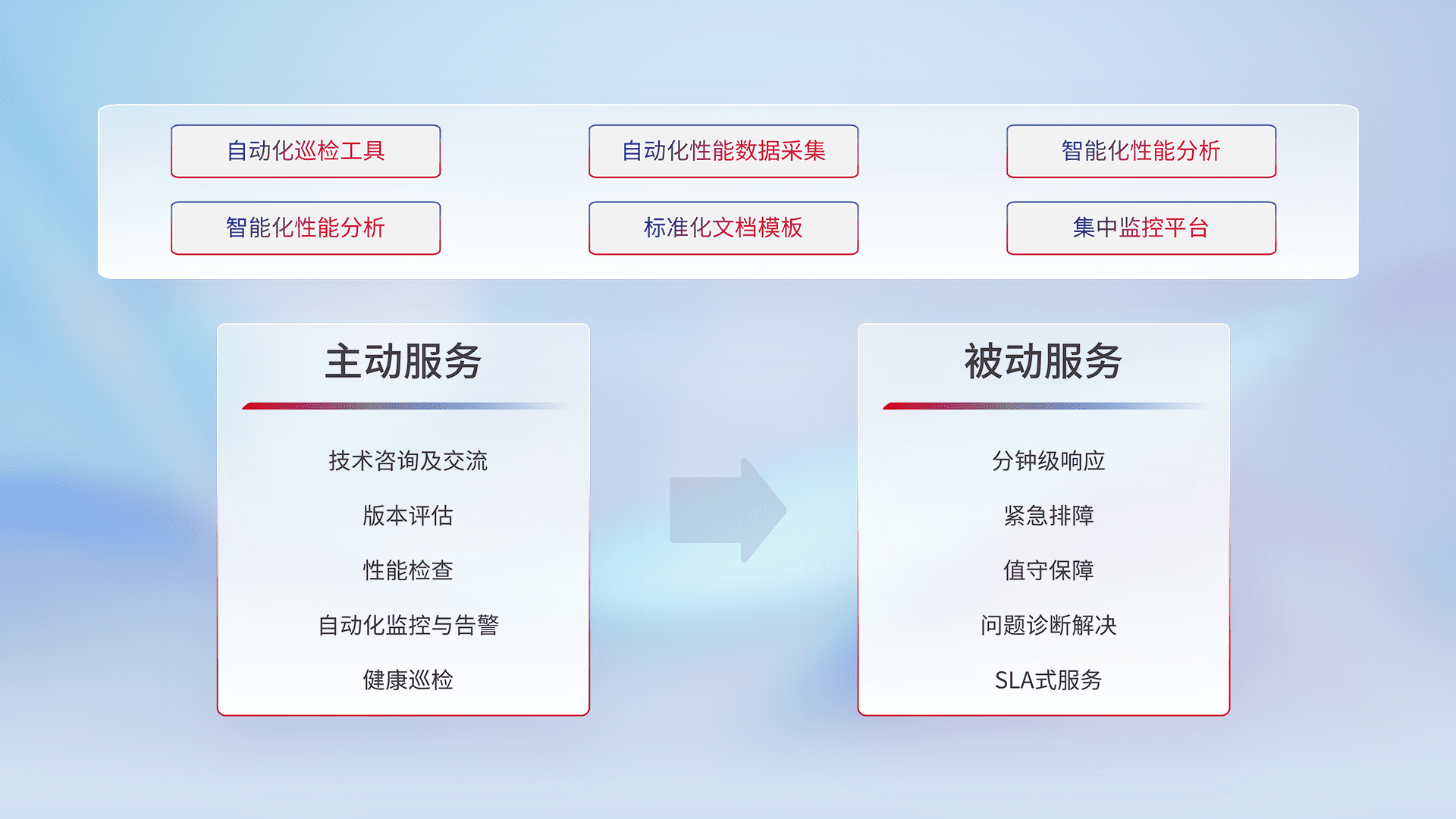 智能化工具和标准化文档,,保障服务质量,,,提供主动服务(包含技术咨询、、、、版本评估、、、性能检查、、、、自动化监控与告警、、健康巡检)和被动服务包含(分钟级响应、、、、紧急排障、、值守保障、、问题诊断解决、、SLA服务)。。。